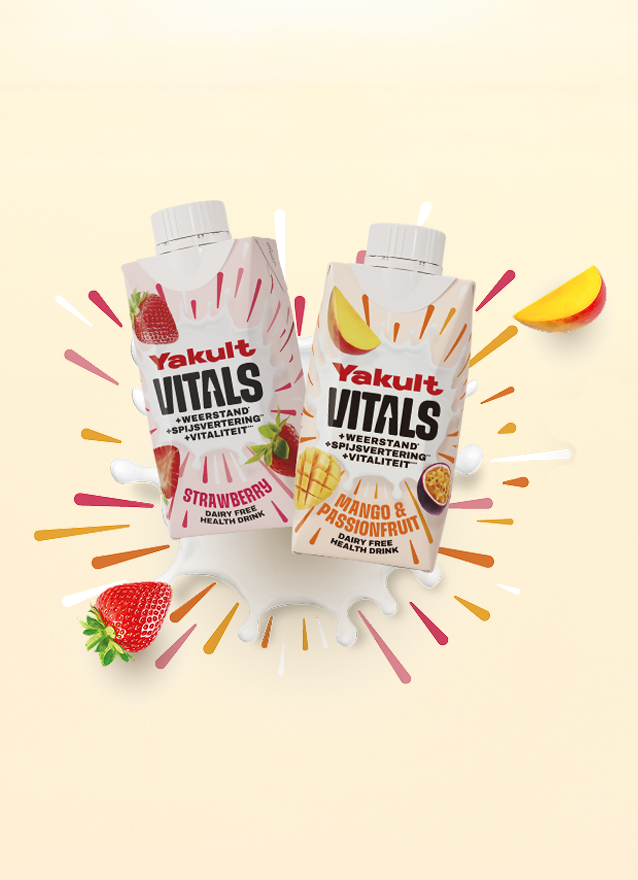 Yakult Vitals is een heerlijke fruitige, zuivelvrije health drink, met vitamine D, calcium, magnesium en zink ter ondersteuning van je immuunsysteem, spijsvertering en vitaliteit. Yakult Vitals is verkrijgbaar in twee heerlijke smaken: Strawberry en Mango & Passionfruit.